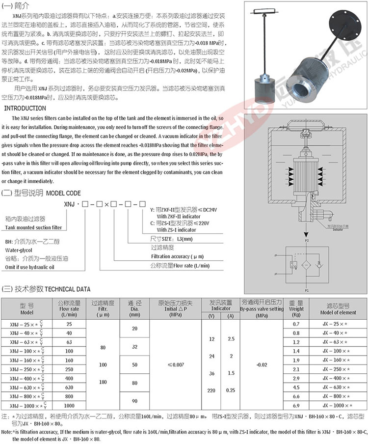 )的專 業廠家,長期以來為冶金、石油、礦山、工程、建筑、塑機、化工、機床、交通等行業的液壓設備提供配套,同時為引進設備提供高品質的國產化備件。今天遠征主講XNJ系列箱內吸油過濾器(新型),詳情請看下圖: